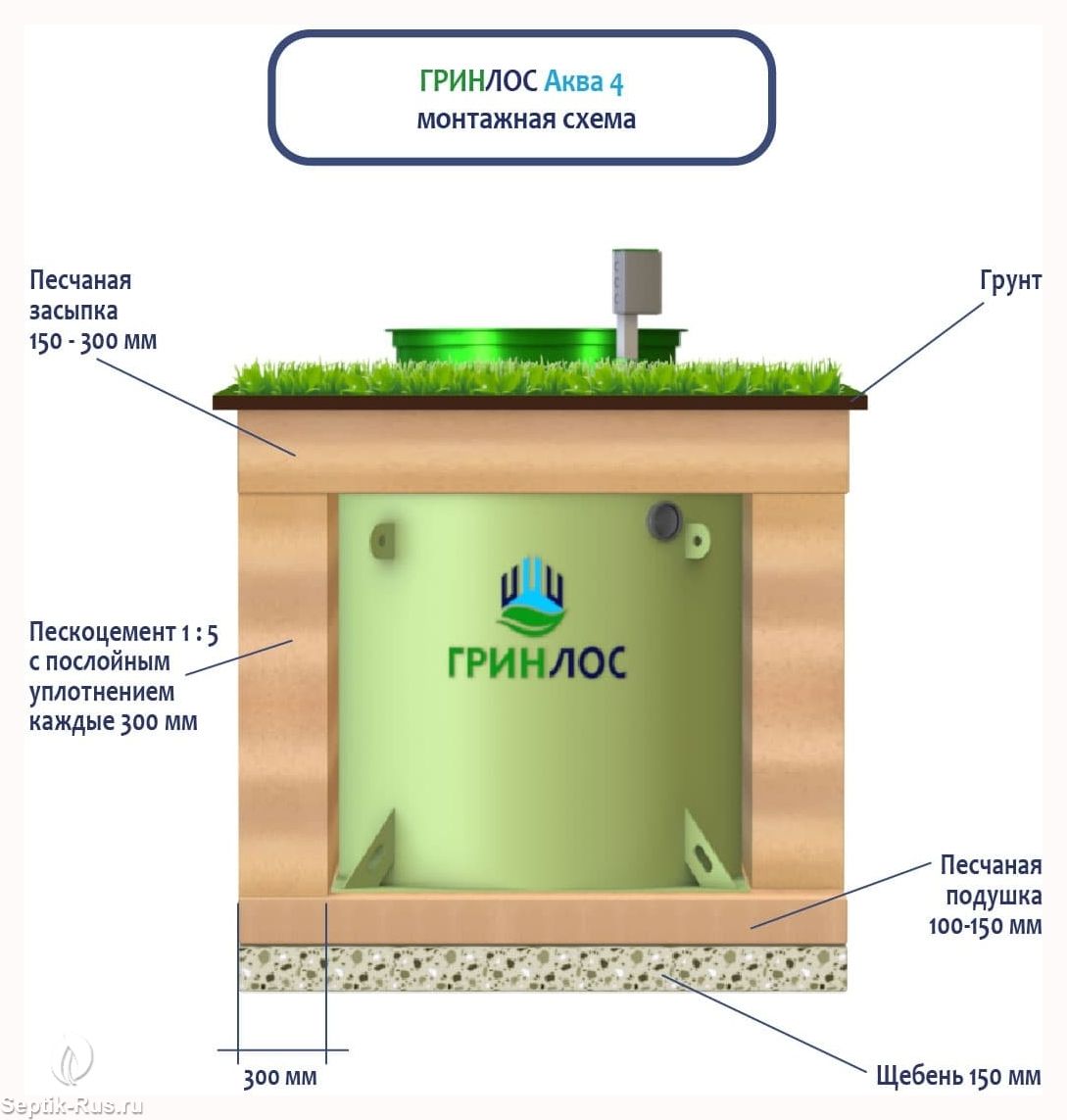 Перед непосредственным монтажом ГРИНЛОС Аква 4 специалисты осуществляют подготовку котлована. Его размеры определяются конструктивными особенностями выбранной модели оборудования.